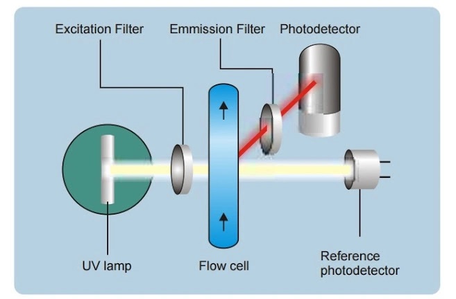 The emission (emitted light) is detected by a high precision photomultiplier sensitive enough to detect very low concentrations down to a few ppb. The excitation light is controlled by a detector to compensate for any variance of the source.