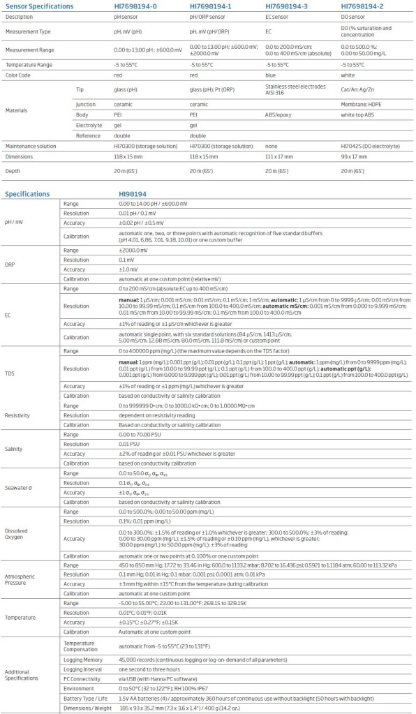 The HI98194 is a waterproof portable logging multi parameter meter that monitors up to 12 different water quality parameters. It’s multi-sensor probe allows for the measurement of key parameters including pH, ORP, conductivity, dissolved oxygen, and temperature. The probe transmits readings digitally to the meter, where data points can be displayed and loaded. The complete system is simple to setup and easy to use.